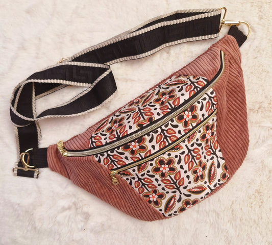 Sac banane en velours côtelé et motif fleuri – fait main en France , idée cadeau Noël