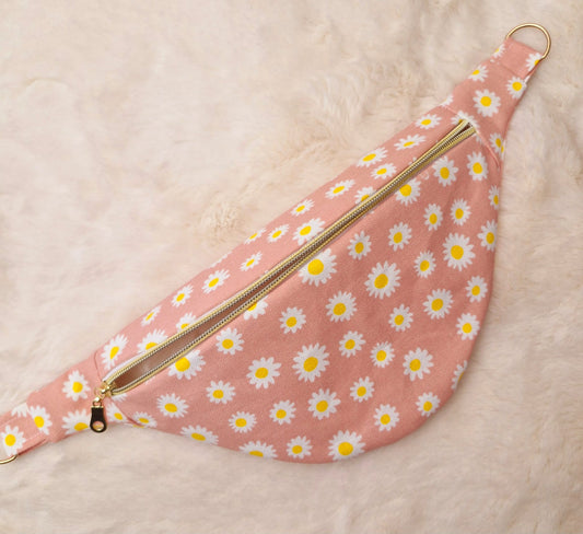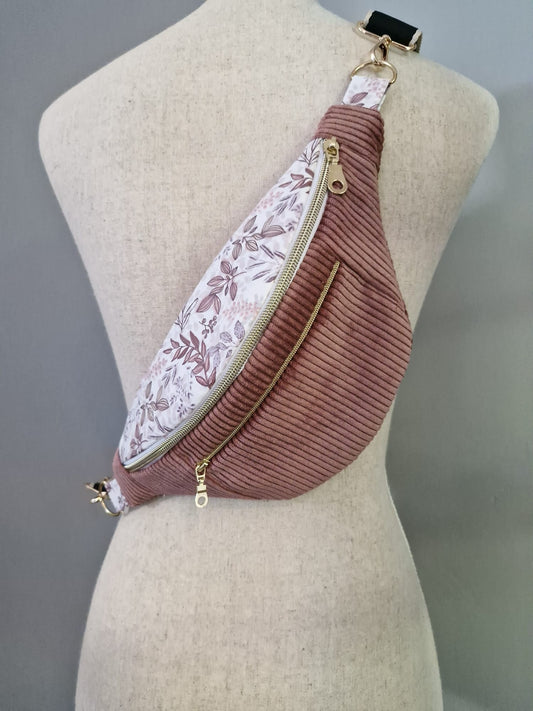 Sac banane femme en velours côtelé rose et fleur "WILLOW"