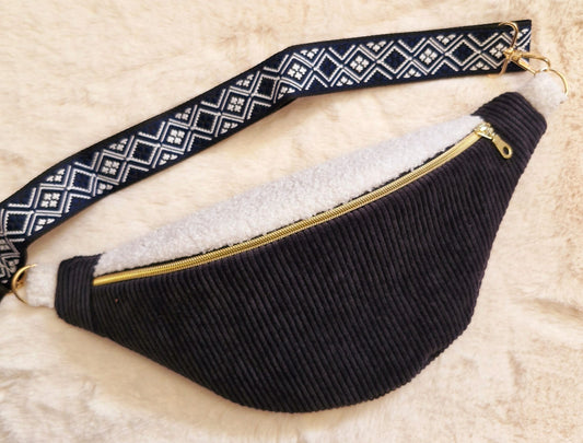 Sac banane femme en velours côtelé noir et moumoute blanche "FANNIA"
