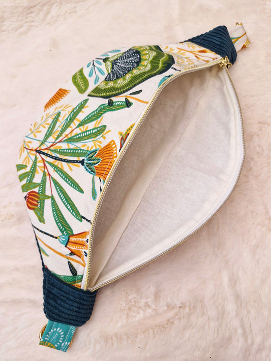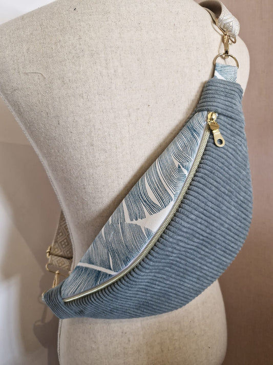 Sac banane femme velours côtelé bleu clair , et motif feuille de palmier, idée cadeau , fait main en France "LOREEN"