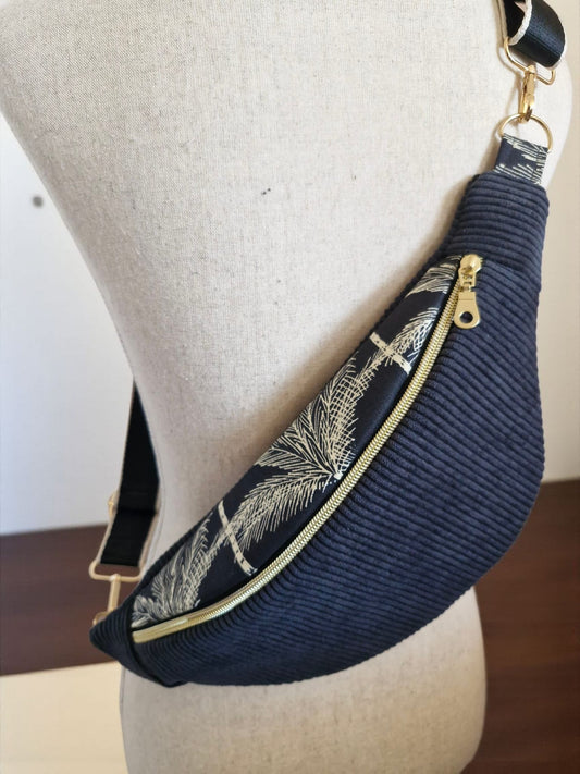 Sac banane femme en velours côtelé noir, motif doré, , sac tendance chic, Fait main en France
