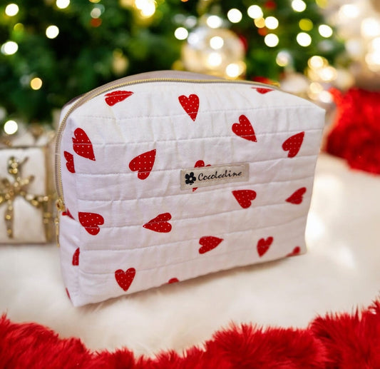 Trousse de Toilette Molletonnée Blanche à Cœurs Rouges – Avec Housse pour Savon et Brosse à Dents
