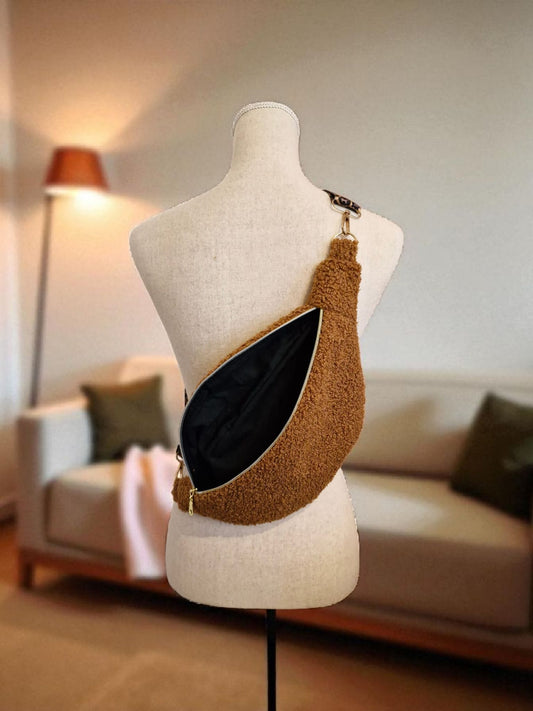 Sac banane en tissu bouclette moumoute camel – fait main en France ,idée cadeau femme