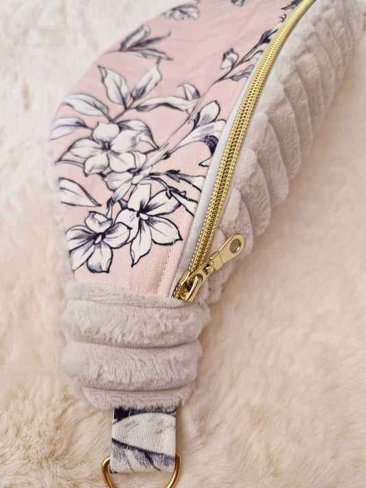 Sac Banane en Velours Blanc Grosse Côte et Toile de Coton Rose Fleurie – Élégance Romantique et Praticité Moderne "JOILY"