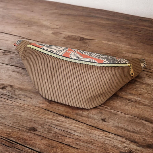 Sac banane en velours côtelé marron et tissu imprimé – fait main en France – Idée cadeau de noël