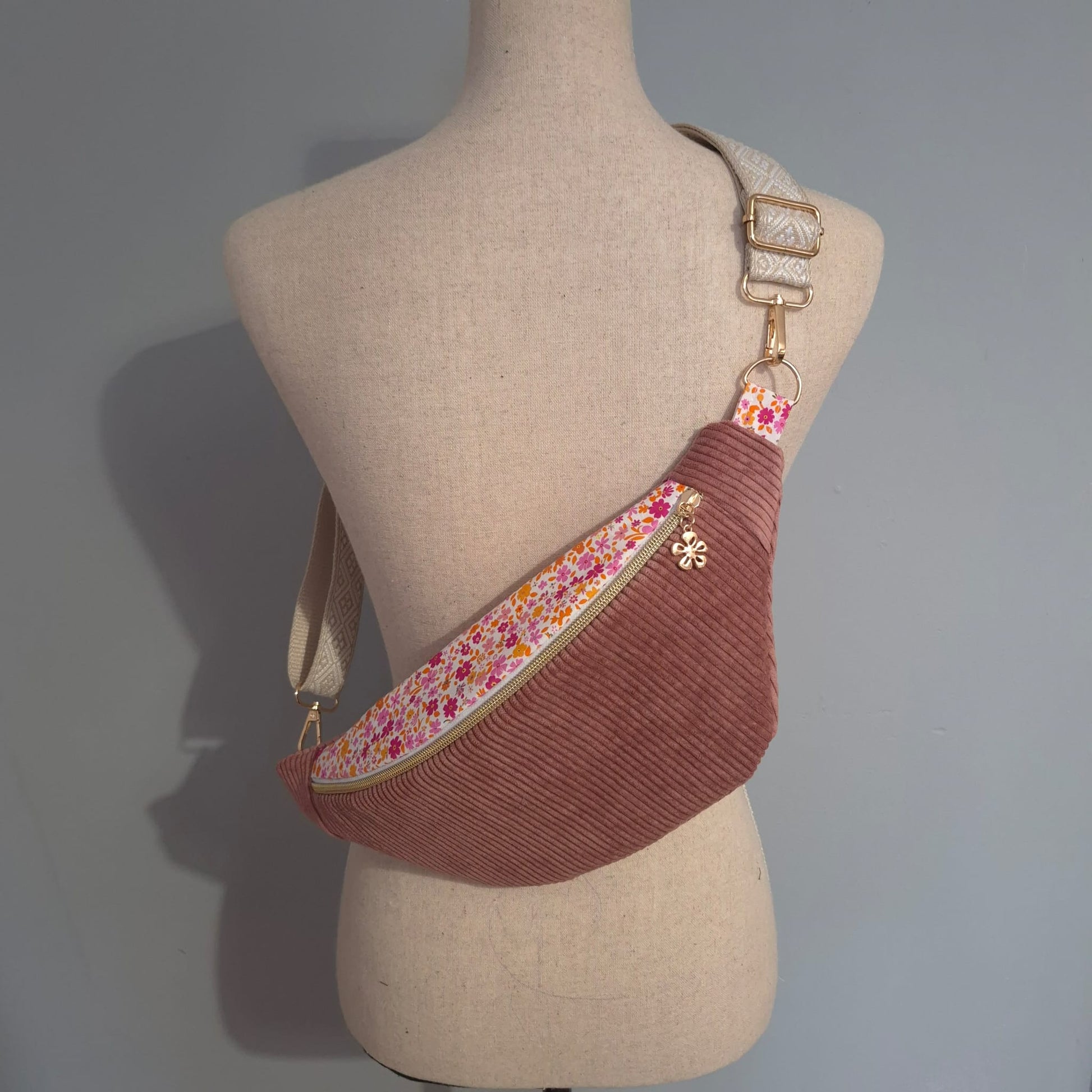 Sac banane en velours côtelé vieux rose – rabat fleuri