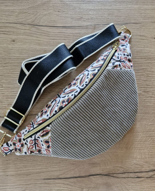 Sac banane pour femme ou enfant , velours côtelé kaki et motif fleuri